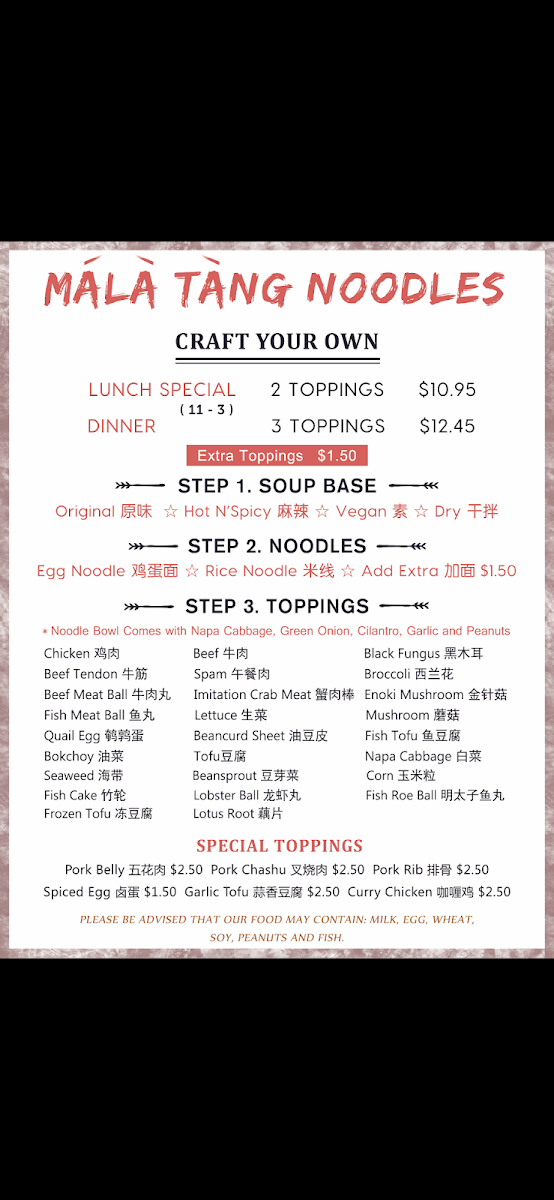Create your own. Any three toppings. Comes with Napa cabbage, cilantro green onion, garlic and peanuts.